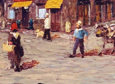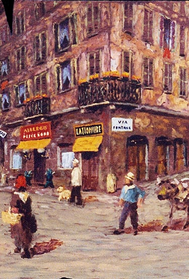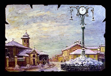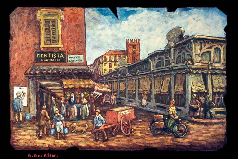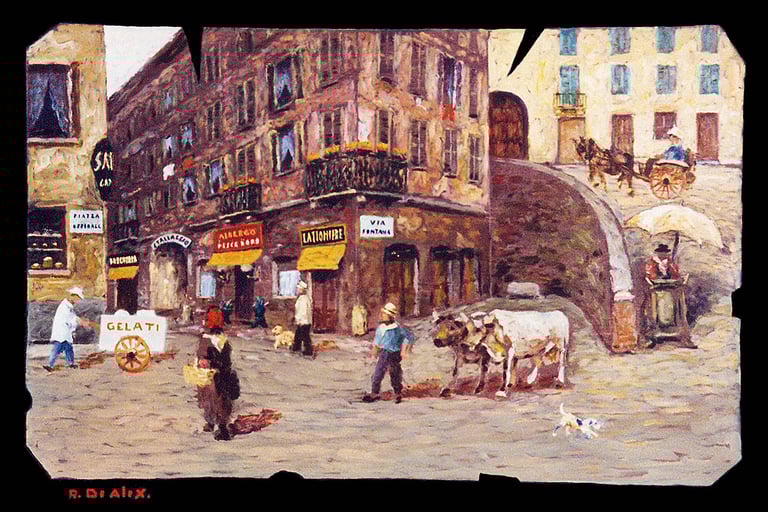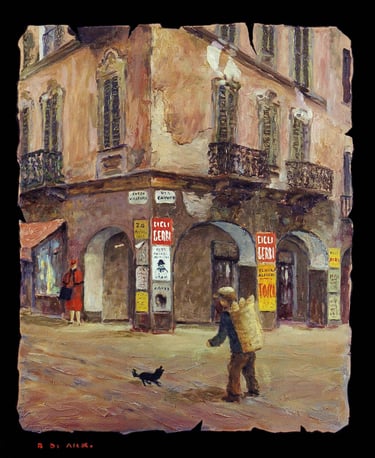 Un viaggio visivo attraverso il tempo e lo sguardo dell'artista. Un confronto tra l'interpretazione pittorica di un angolo di città con la sua controparte fotografica, catturata con la stessa inquadratura. Scopri come il quadro a olio e la fotografia offrono due prospettive uniche sullo stesso luogo, mescolando emozioni, dettagli e atmosfere diverse.